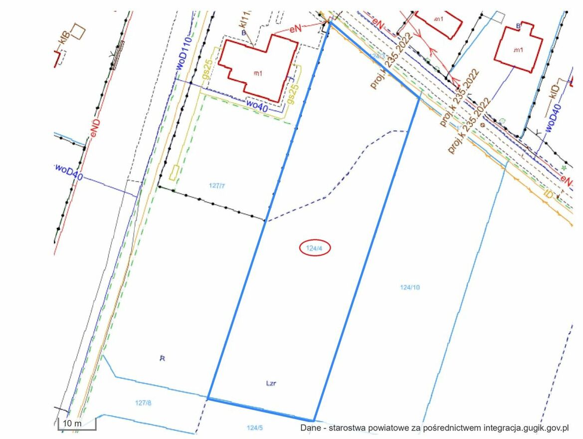 Działka nr 124/4 położona jest w pierwszym szeregu działek ulicy Akacjowej (asfaltowa) - w ulicy prąd, woda; projektowana jest kanalizacja. Kształt działki w formie prostokąta, z krótszą linią granicy od ulicy. Wymiary działki: 27,5 m x 90 m.